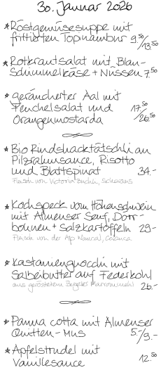 Wir kochen mit Sorgfalt und Liebe – und servieren mit Herz und Verstand. Unser wechselndes Tagesangebot besteht aus vegetarischen Gerichten und solche mit hochwertigem Fleisch, meist Bio. Einige Klassiker sind immer auf der Menükarte. Die Wein- und Käsekeller sind gut gefüllt mit Spezialitäten von nah und fern, die auf Schlemmer und Geniesserinnen warten!