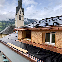 Seit Juni 2021 wird das Landhus mit eigenem Strom von der flächendeckenden Photovoltaik auf dem Dach versorgt und die Wärme für Heizung und Wasser von einer Wärmepumpe erzeugt, ergänzt durch Wärmerückgewinnung von der Kühlung. Auch unser Auto liebt den Strom, den die Domleschger Sonne produziert!