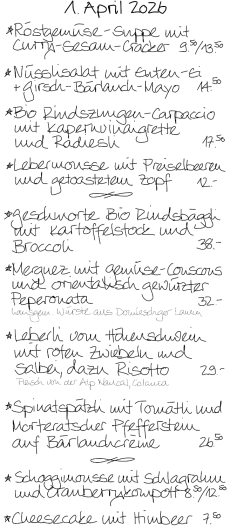 Zum festlichen Tag bieten wir ein frühlingshaftes Menü mit einer feinen Auswahl von Vorspeisen, Hauptgängen und Desserts an, alles frisch mit...