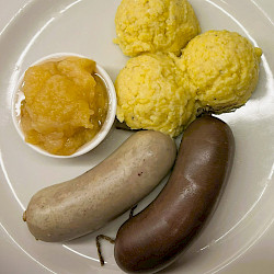 Unsere drei (Alp-) Schweine haben einen glücklichen Sommer auf der Alp Naucal, zuhinterst im Calancatal, bei Doris Galfetti von Almens verbracht und feinste Ziegenmilchschotte gefuttert. Weil die Alp nicht zertifiziert ist, dürfen wir sie nicht Alpschweine nennen - darum haben wir sie «Höhenschweine» getauft. Die verschiedenen Fleischstücke servieren wir eins ums andere, wir starteten mit den hausgemachten Blut- und Leberwürsten, jetzt ist der Kochspeck dran. Übrigens - Rohschinken und Speck auf dem Landhus-Plättli stammen ebenfalls vom Höhenschwein!