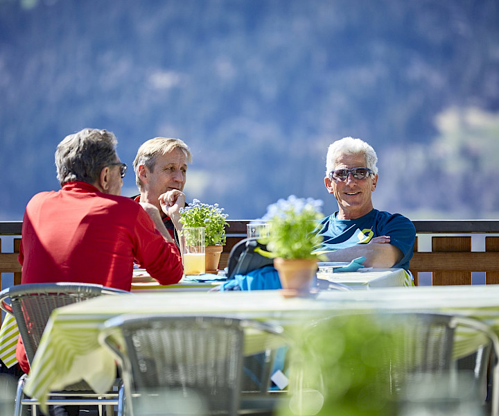 Das Herzstück des Landhus ist seit eh und je die Sonnenterrasse, von wo der Blick über Obstbäume auf die gegenüberliegende Häuserzeile und von dort weiter zum Beverin schweift, um schliesslich auf dem breiten Rücken des Heinzenbergs zu verweilen. Hier sind Sie schön geschützt vor dem Wind, der in Almens manchmal um die Ecken streift. Auch im Winter und besonders im Frühling geniesst man hier die wärmenden Sonnenstrahlen gern.